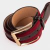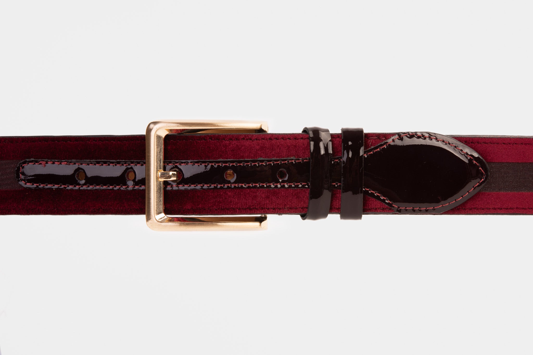 Elevate your ensemble with our burgundy men’s belt, a perfect complement to sophistication and personal expression. This exquisite belt features a seamless blend of velvet and satin, creating a soft and elegant transition without visible stitching. The buckle, adorned with gleaming gold accents, adds a touch of opulence to this refined accessory.