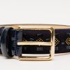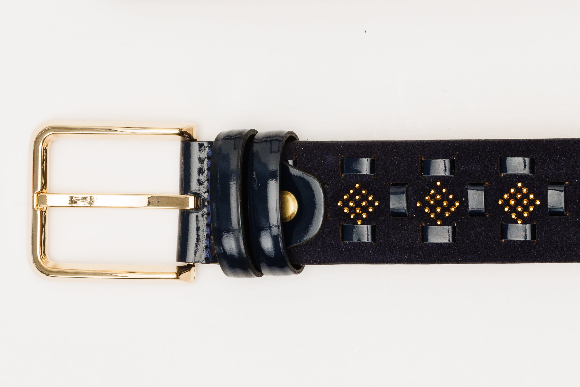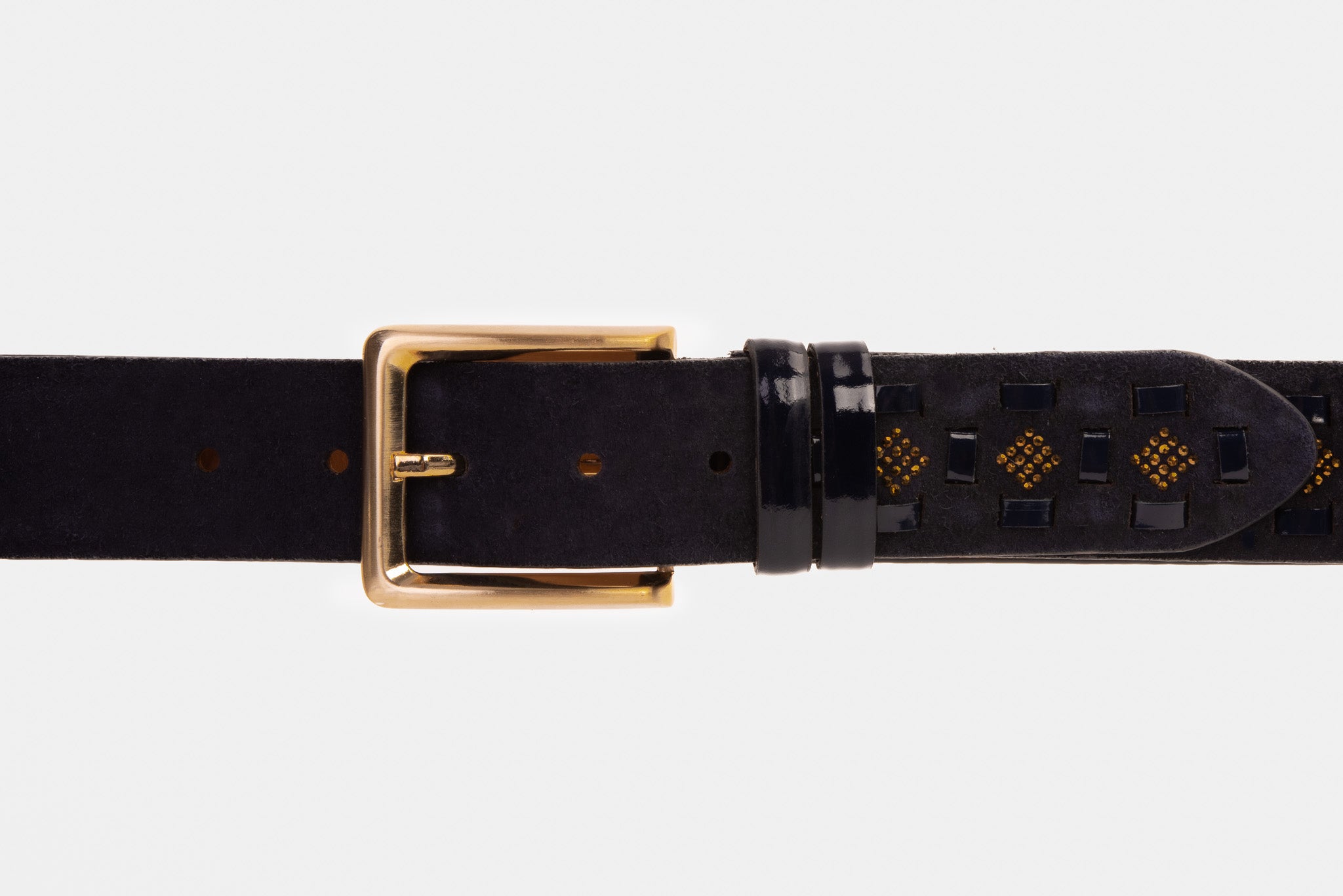 Designed with Vinci Leather’s unique touch, the Vicino Navy Leather Belt is an extraordinary accessory that elevates your elegance to new heights. With its shining details, velvet with patent leather weaves, and handcrafted sequins, it’s a true work of art.