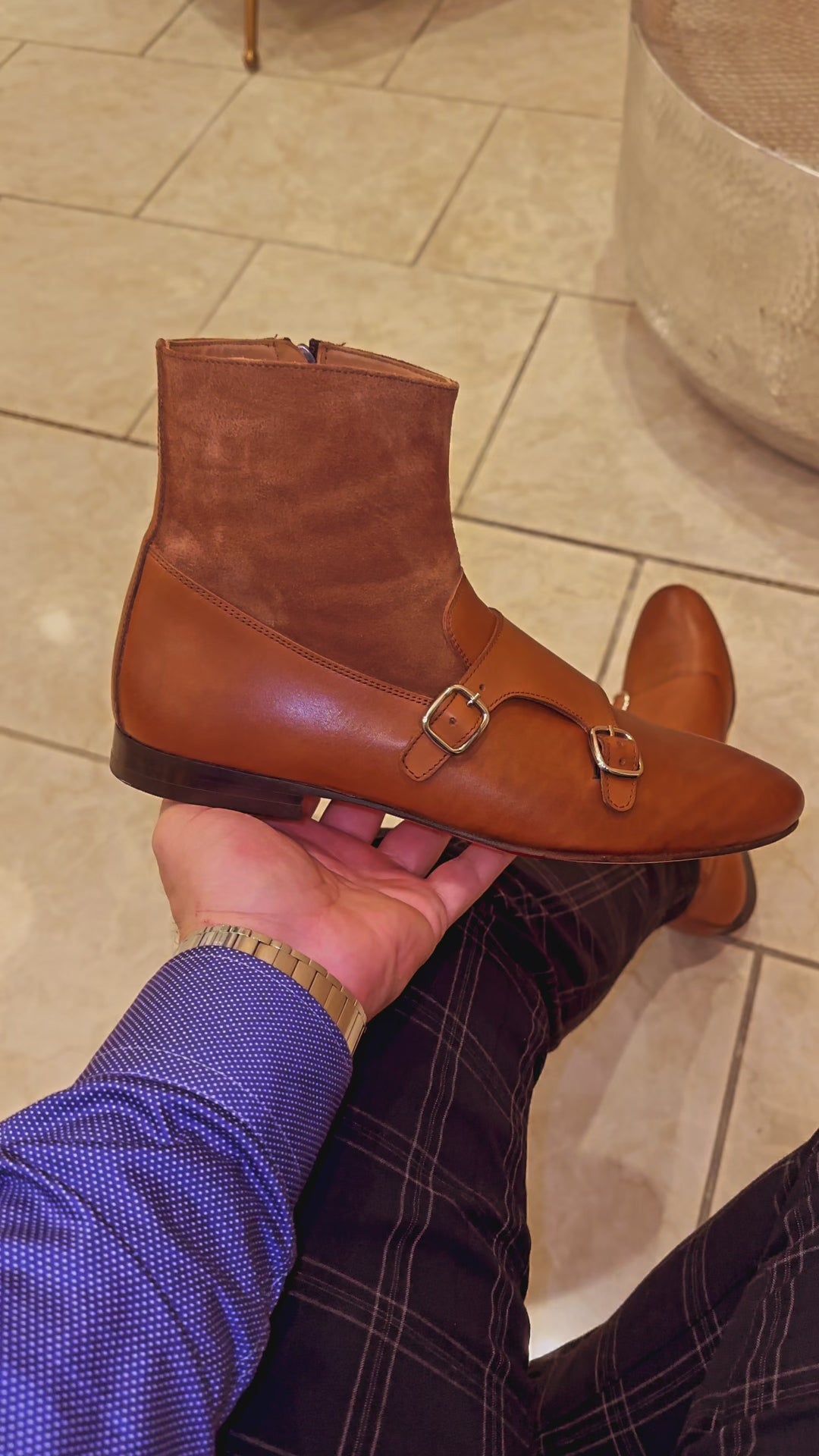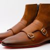 Preston Tan Leather & Suede Double Monk Strap Ankle Boot with a Zipper: Crafted Elegance for Effortless Style