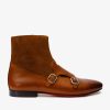Step into refined elegance with the Preston Tan Leather & Suede Double Monk Strap Ankle Boot, meticulously crafted from 100% premium calf leather. This boot combines sophisticated design with modern convenience, featuring a side zipper for effortless wear and suede detailing for added grace at the ankle.