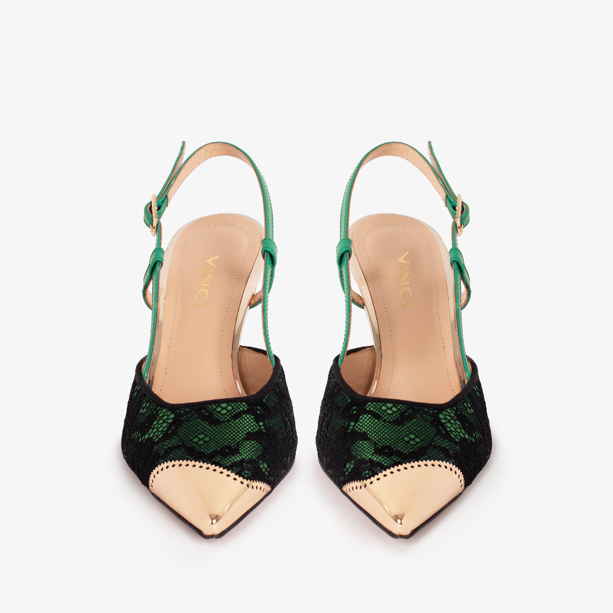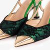 Stylish Design: The upper part of the sandal features a striking combination of green leather adorned with black guipure lace. This intricate lace detail adds a touch of sophistication and femininity to the sandal, elevating its overall aesthetic. Additionally, the gold metal embellishment on the toe adds a unique and eye-catching element, giving the sandal a touch of glamour and individuality.