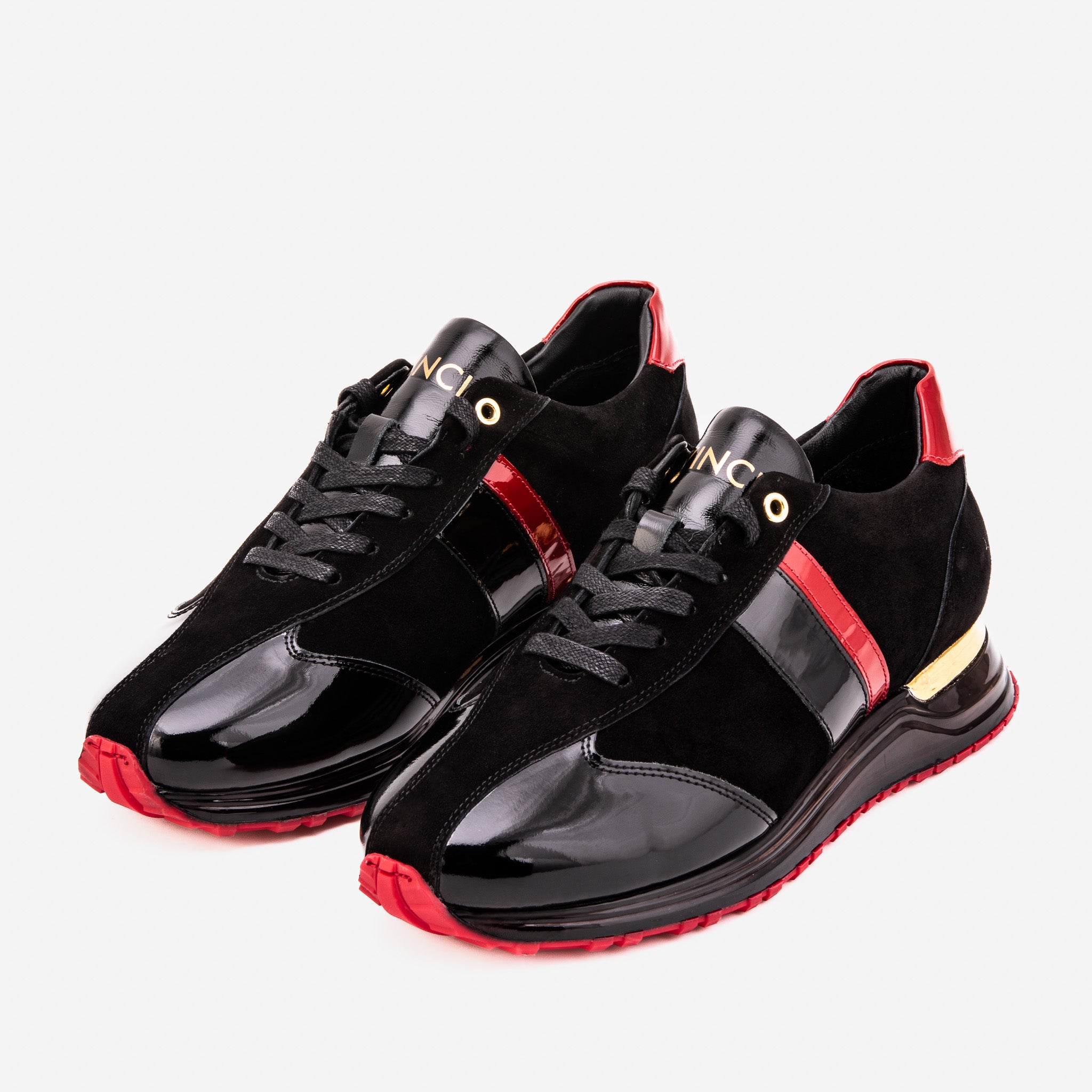 Sophisticated black base with bold red accents and a gold metallic heel plate for a luxury touch