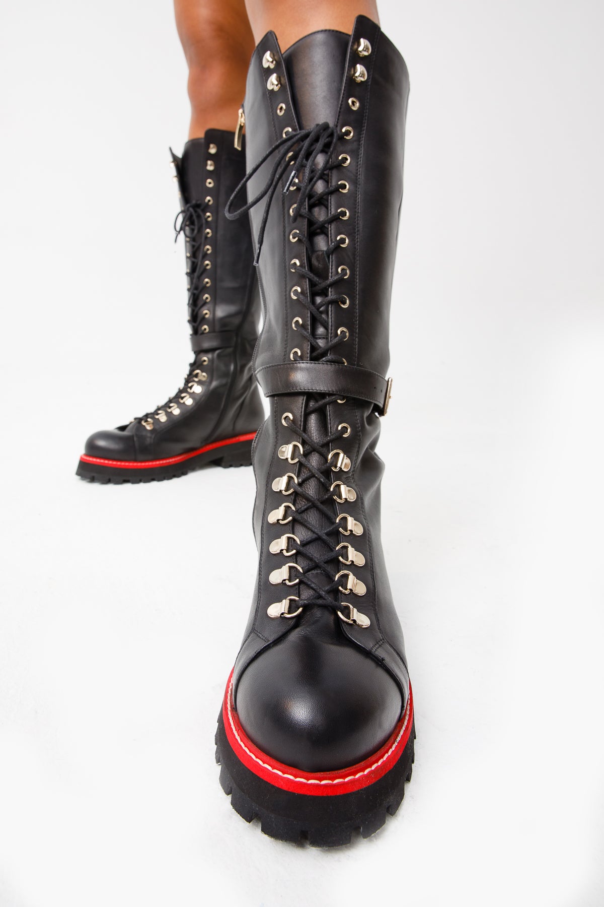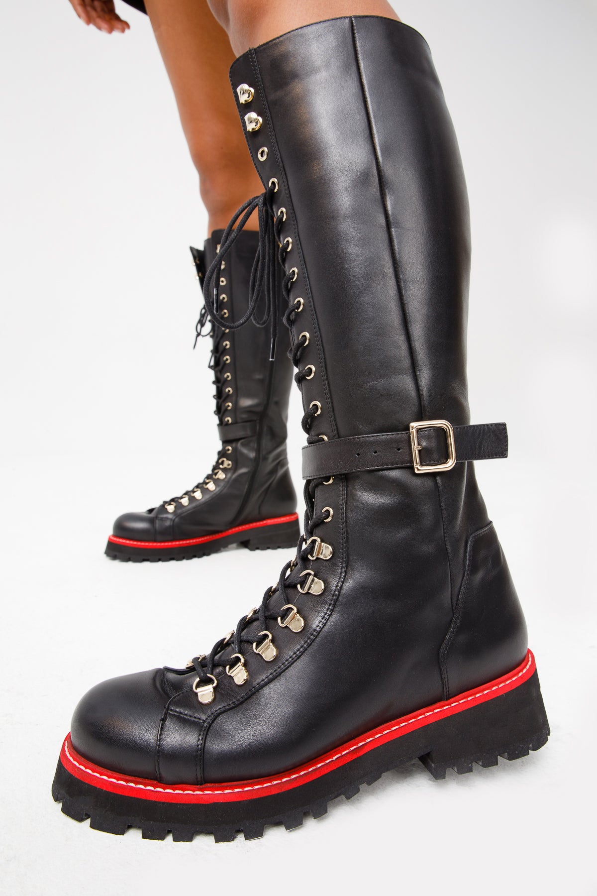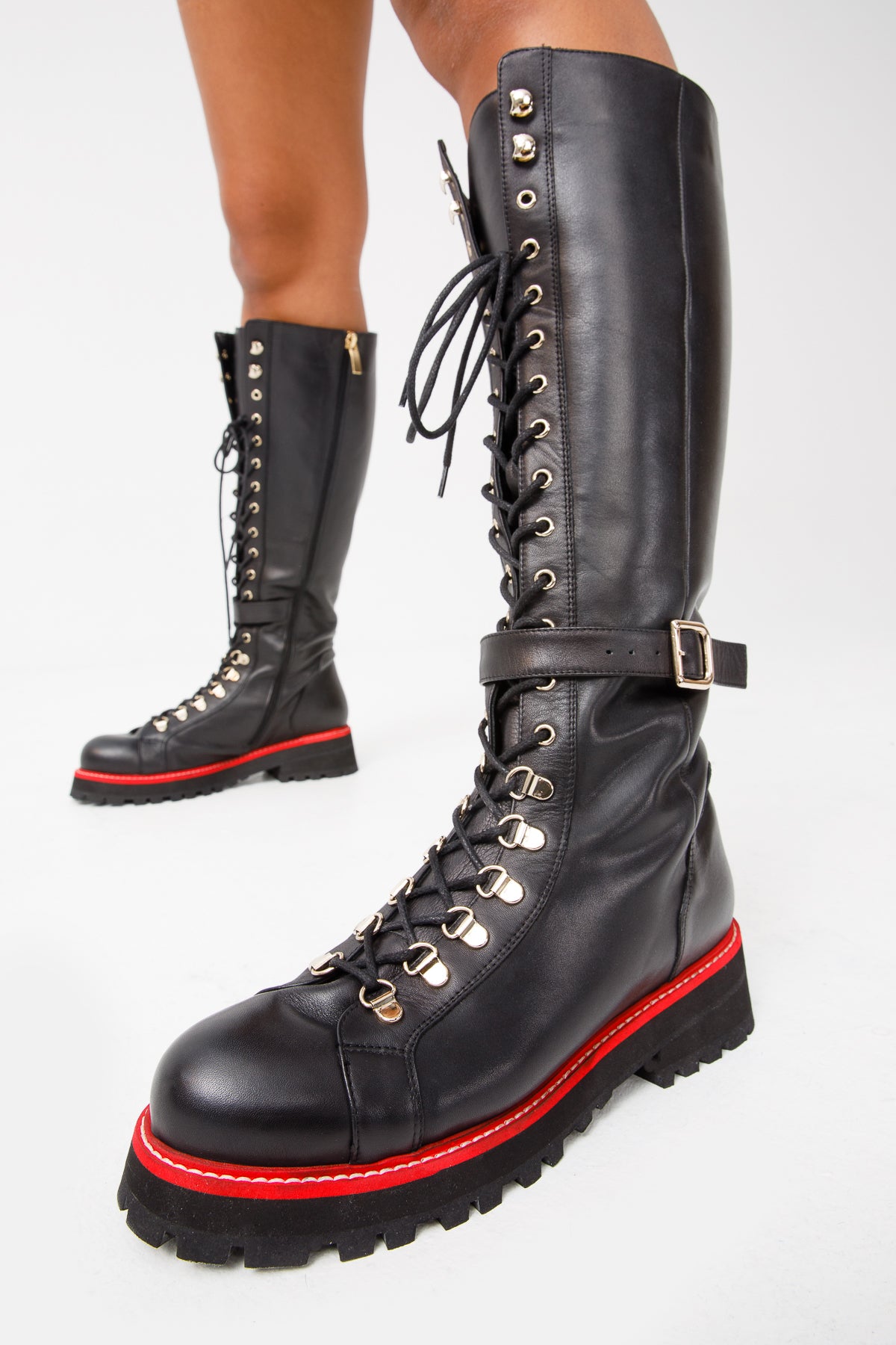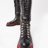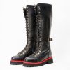 - The combination of black leather, lace-up design, and zipper detail creates a unique and fashionable knee-high boot.