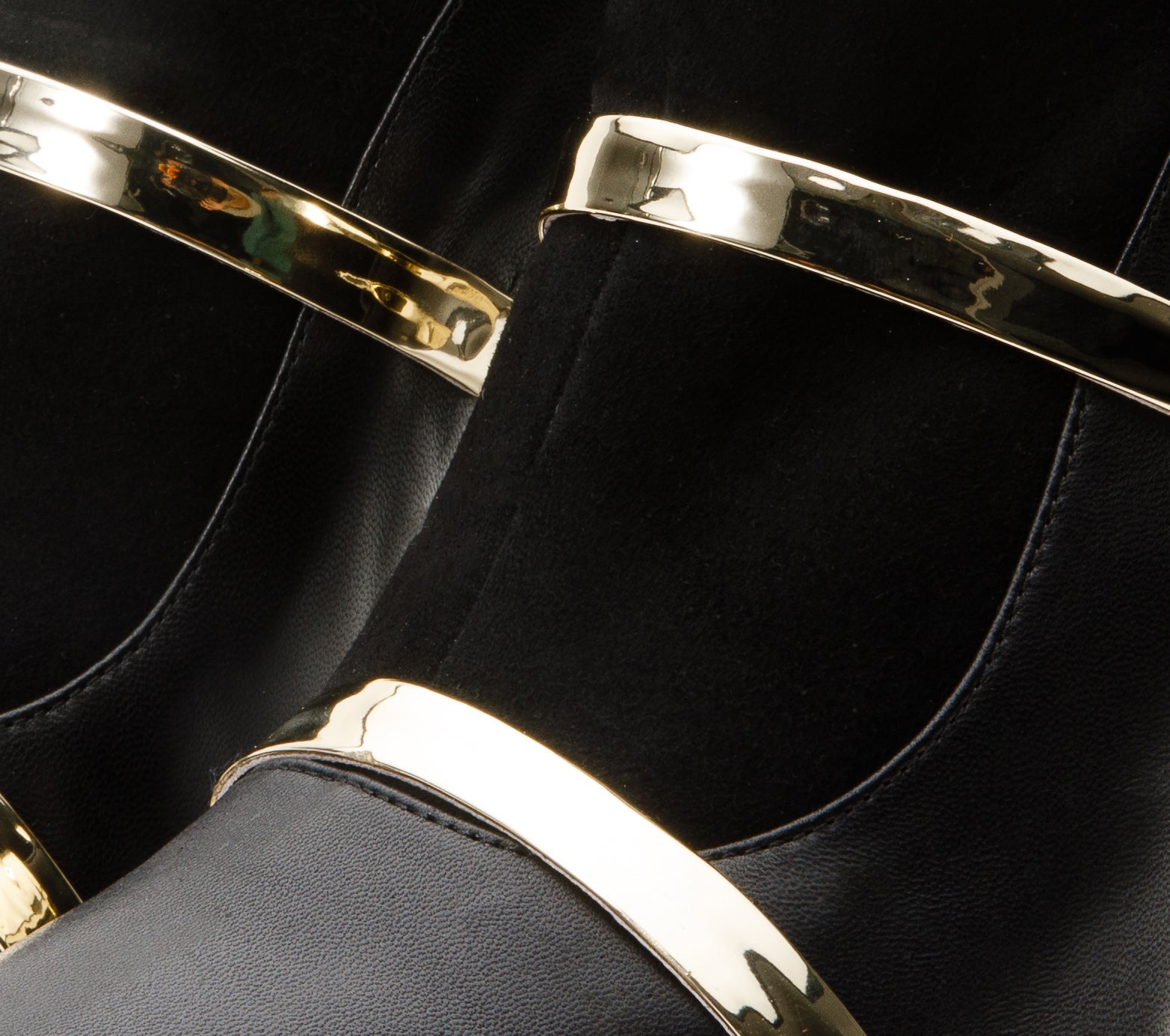 - Experience subtle opulence with two carefully placed gold strip details at intervals, creating a chic and glamorous aesthetic. These gold accents add a hint of glamour to your every step.