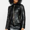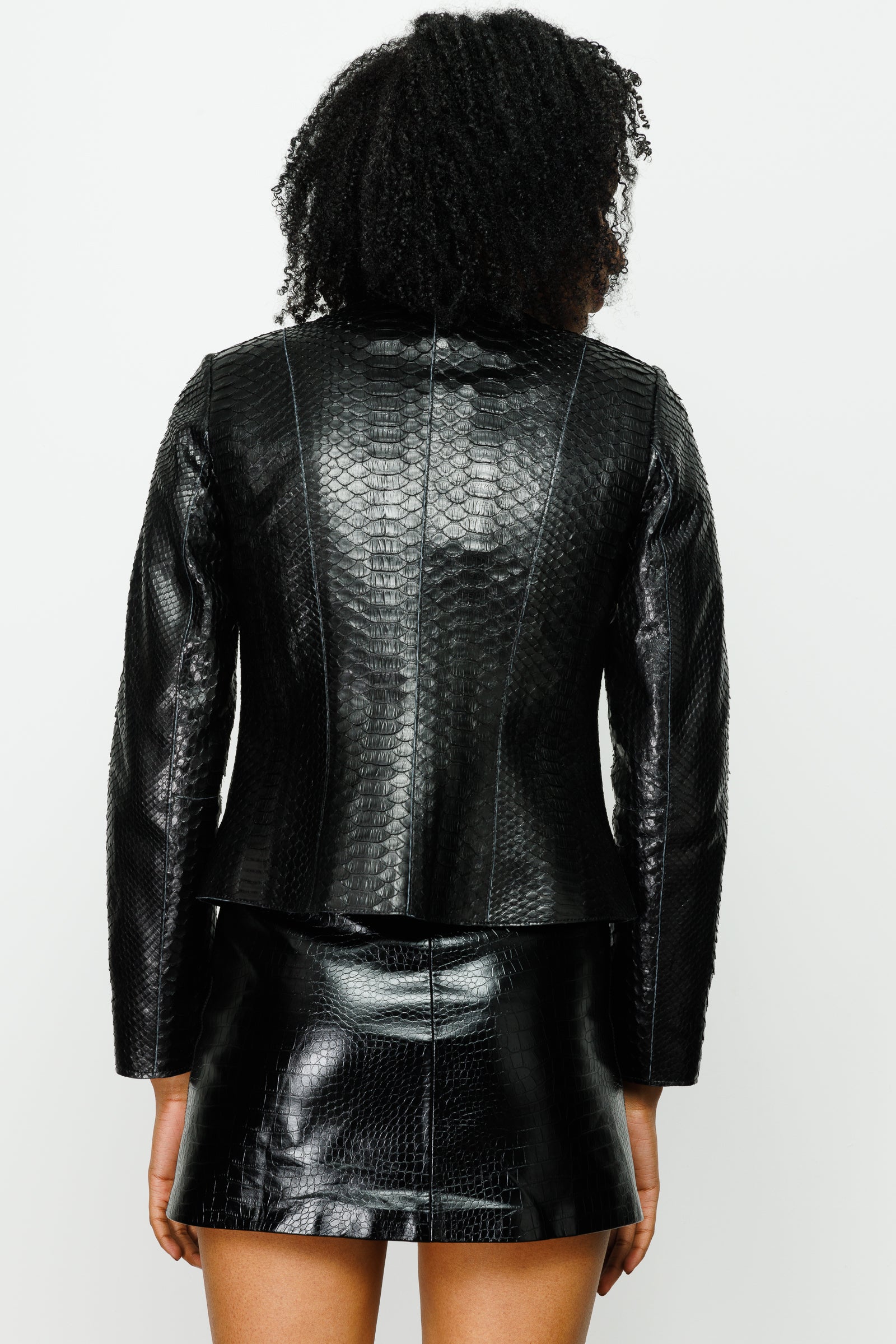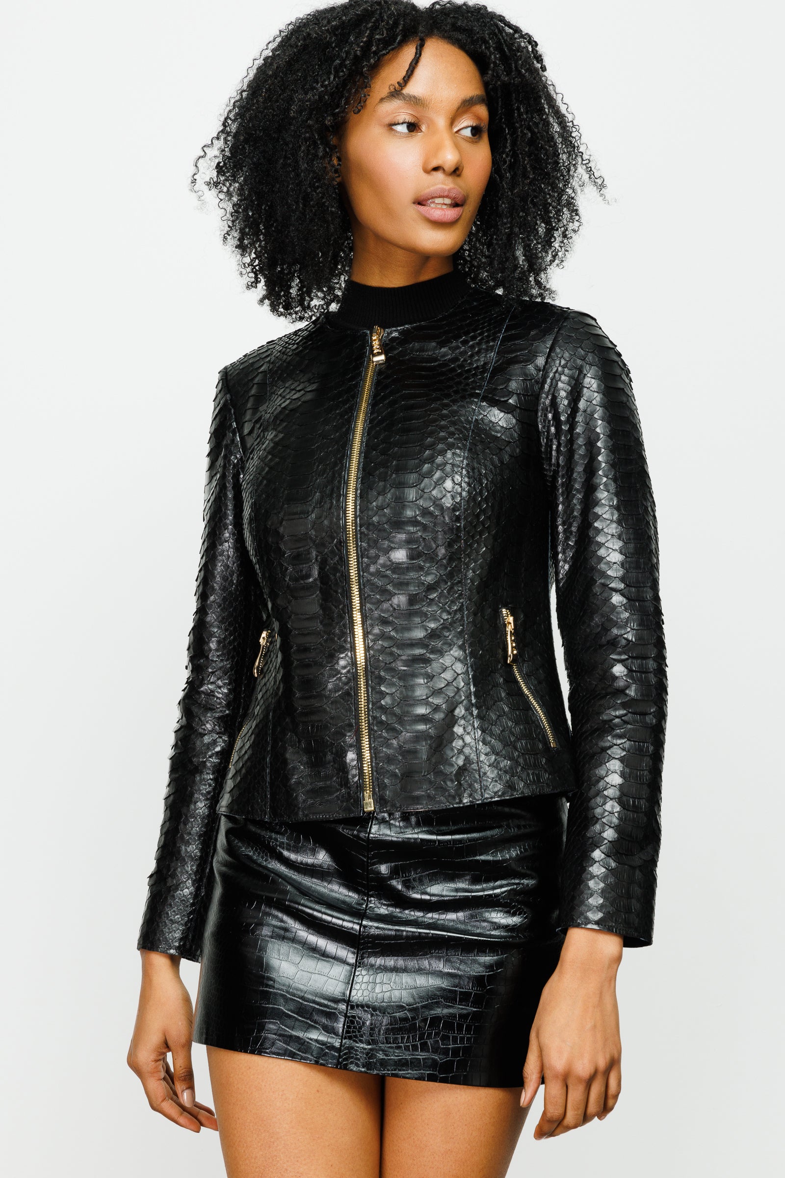 Elegance and simplicity are the key elements made of this fine PYTHN skin biker-jacket coat. Snap buttoning band collar. The iconic metal lion head is applied on the hanging loop at yoke. Zipper fastening. Three pockets: slit- and zip-up ones. Buttoning cuffs. Inner lining.