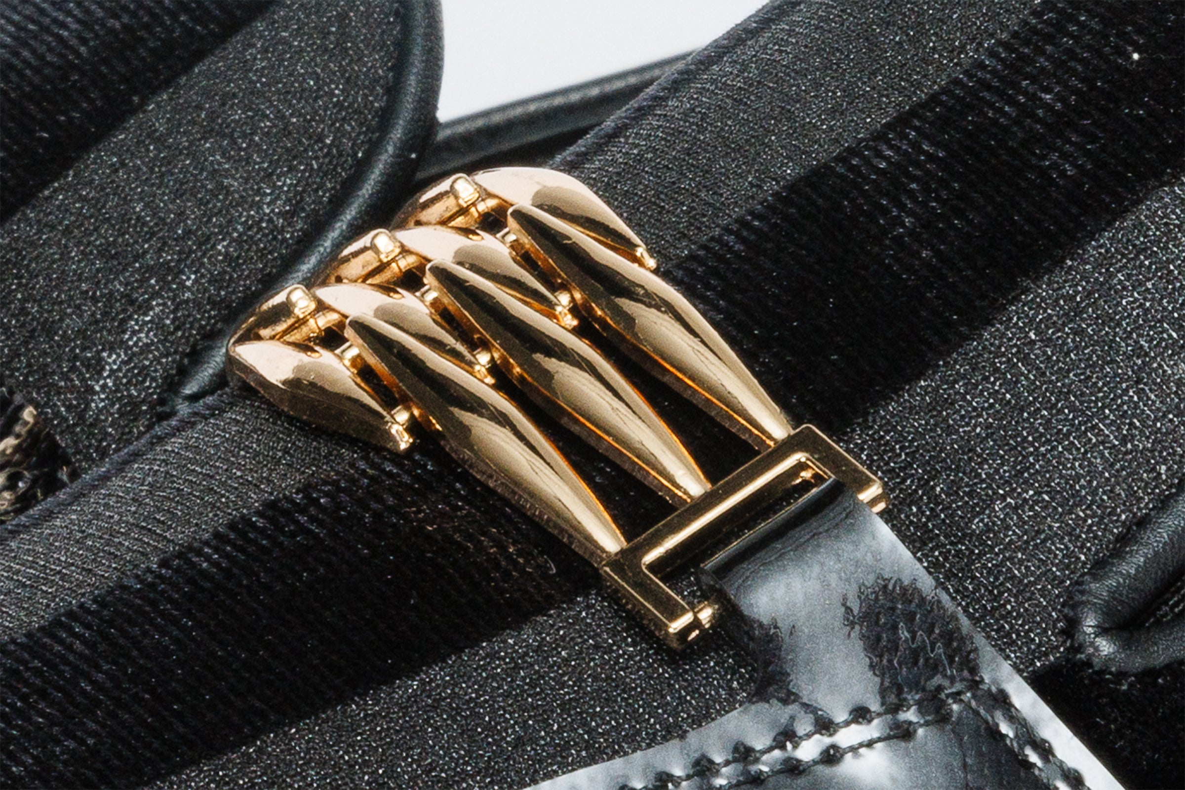 Complete your ensemble with the separately available coordinating belt. The belt mirrors the intricate details of the loafer, featuring the same seamless blend of velvet, satin, and patent leather, ensuring a polished and coordinated look from head to toe.