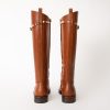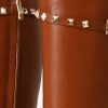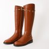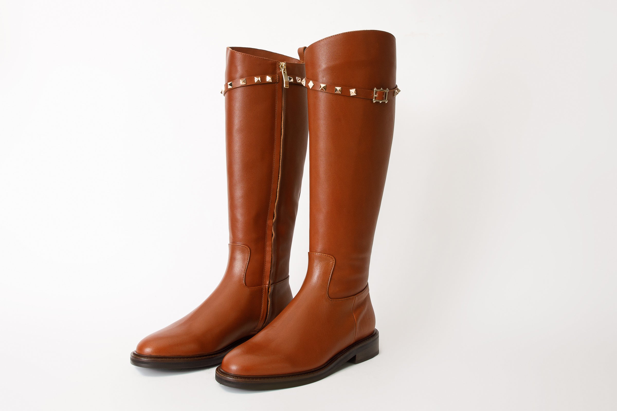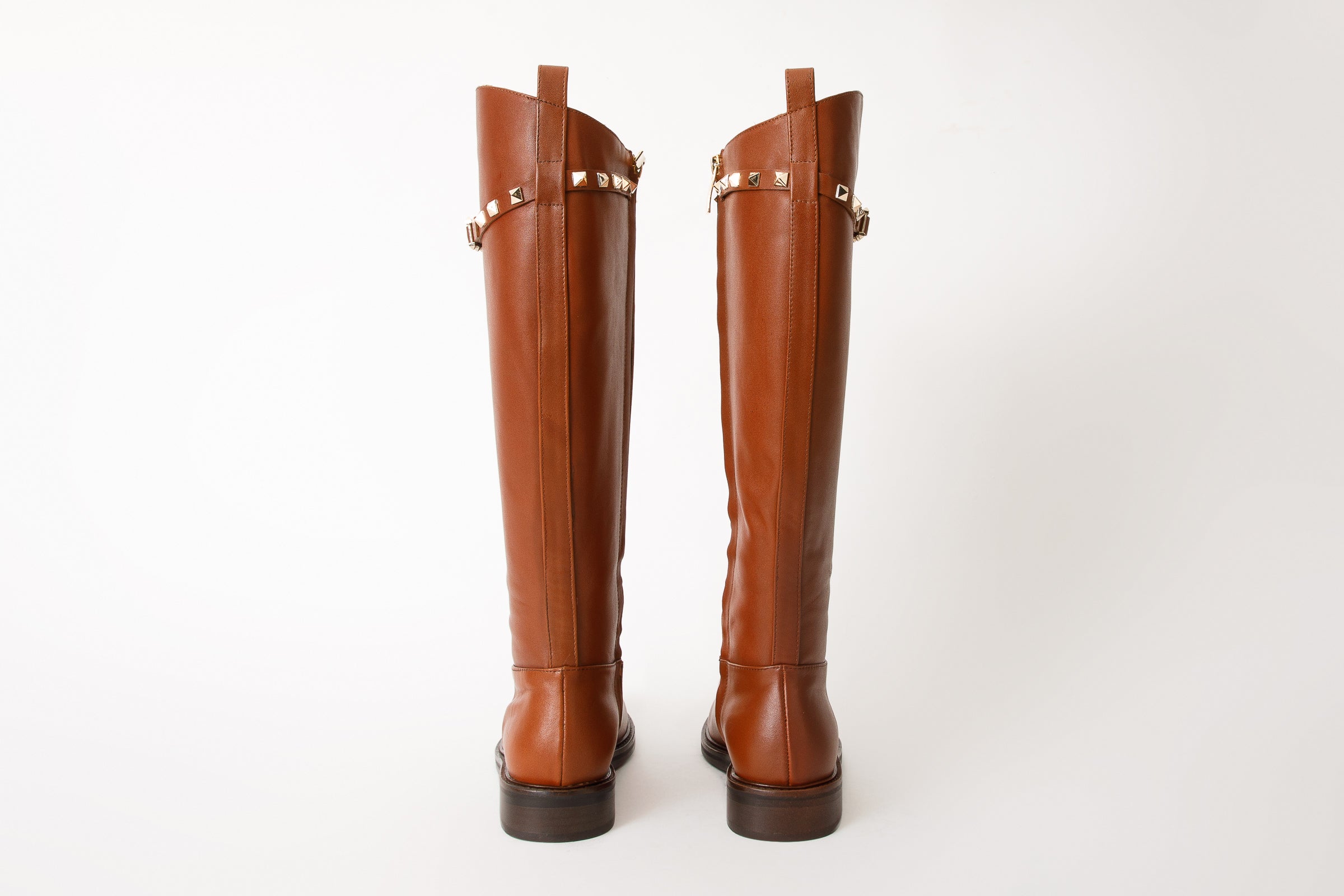 - The calf area of the boot features a leather buckle adorned with gold spikes.