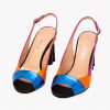 Modern Harmony of Blue, Fuchsia, and Orange: The Rize Multicolor Pumpkin Heel Leather Women Sandal captivates with a modern harmony of serene sax blue, vibrant fuchsia, and energetic orange, creating a striking and contemporary color palette.