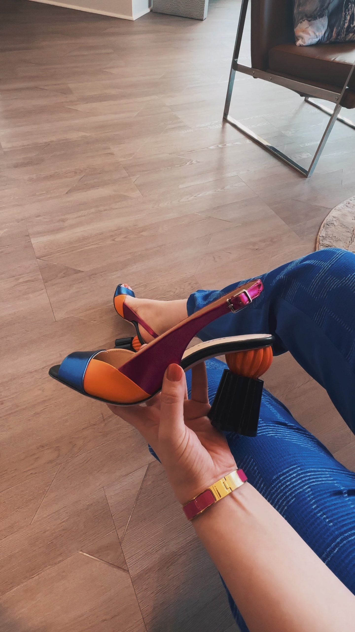 Rize Multicolor Pumpkin Heel Leather Women Sandal: A Modern Symphony of Blue, Fuchsia, and Orange