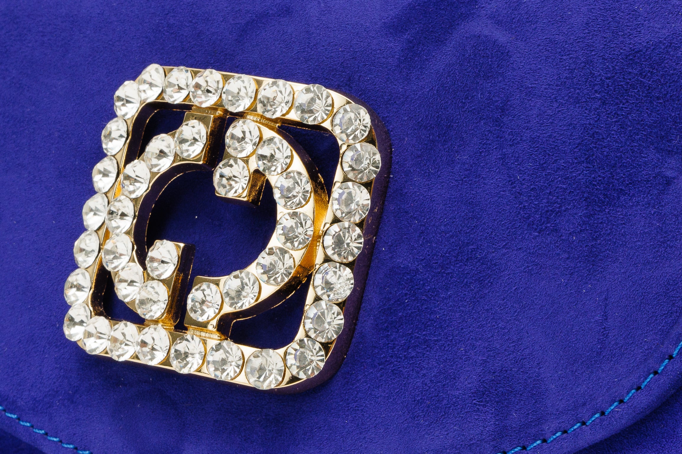 Jewelry Embellishments: Adorned with a captivating array of sparkling jewels, the California Handbag in Sax Blue is transformed into a dazzling accessory, adding a touch of glamour and individuality to your ensemble.
