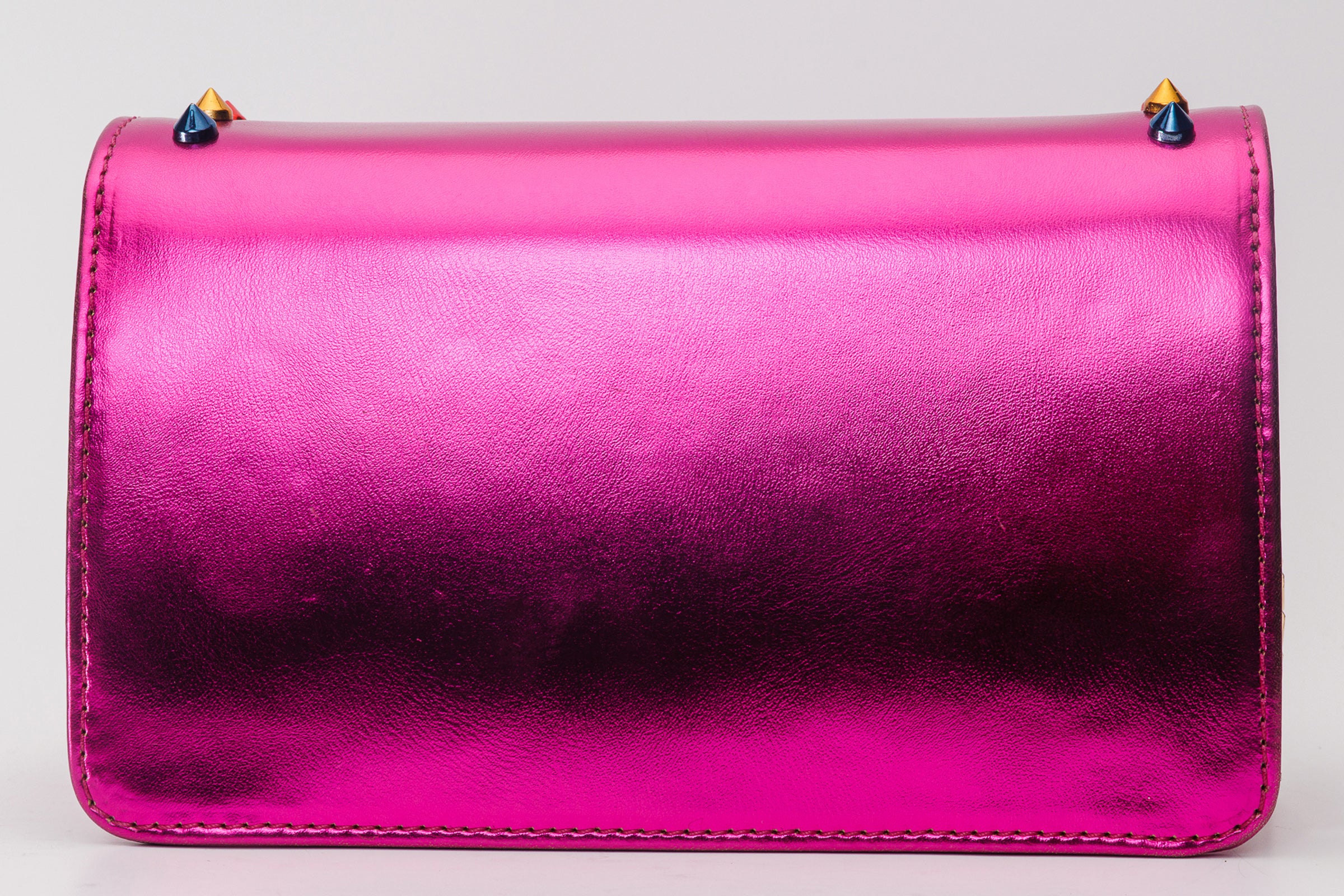 Vibrant Elegance: Caris Fuchsia Leather Handbag invites you to indulge in supreme craftsmanship and vibrant spike accents, creating a piece that seamlessly blends luxury with a rebellious edge.