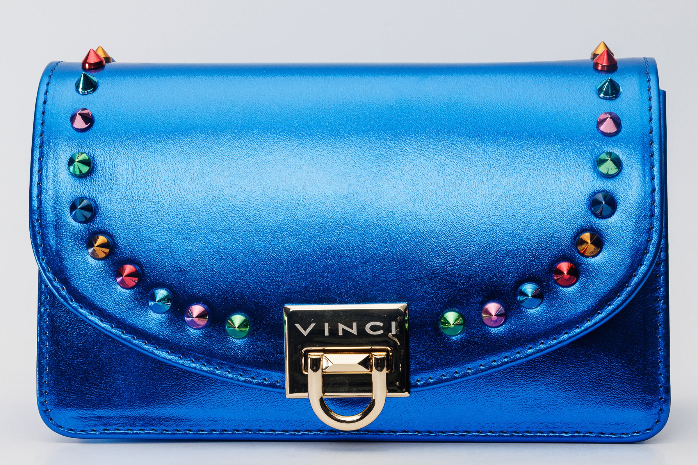 Caris Sax Blue Leather Handbag: Effortless Sophistication with Multicolor Spike Accents