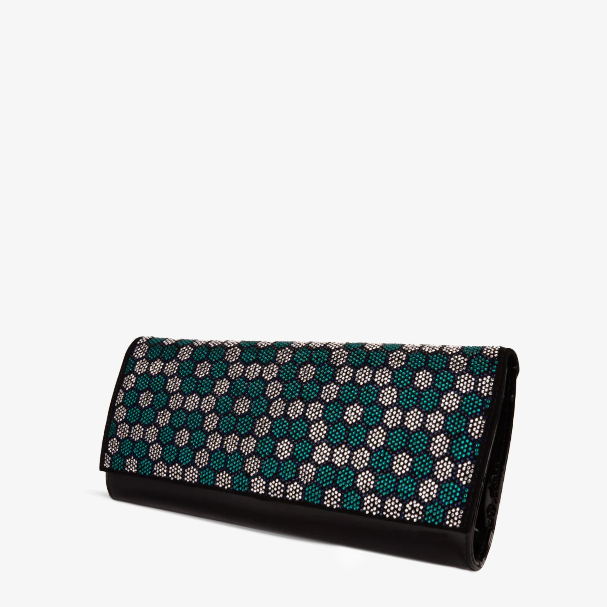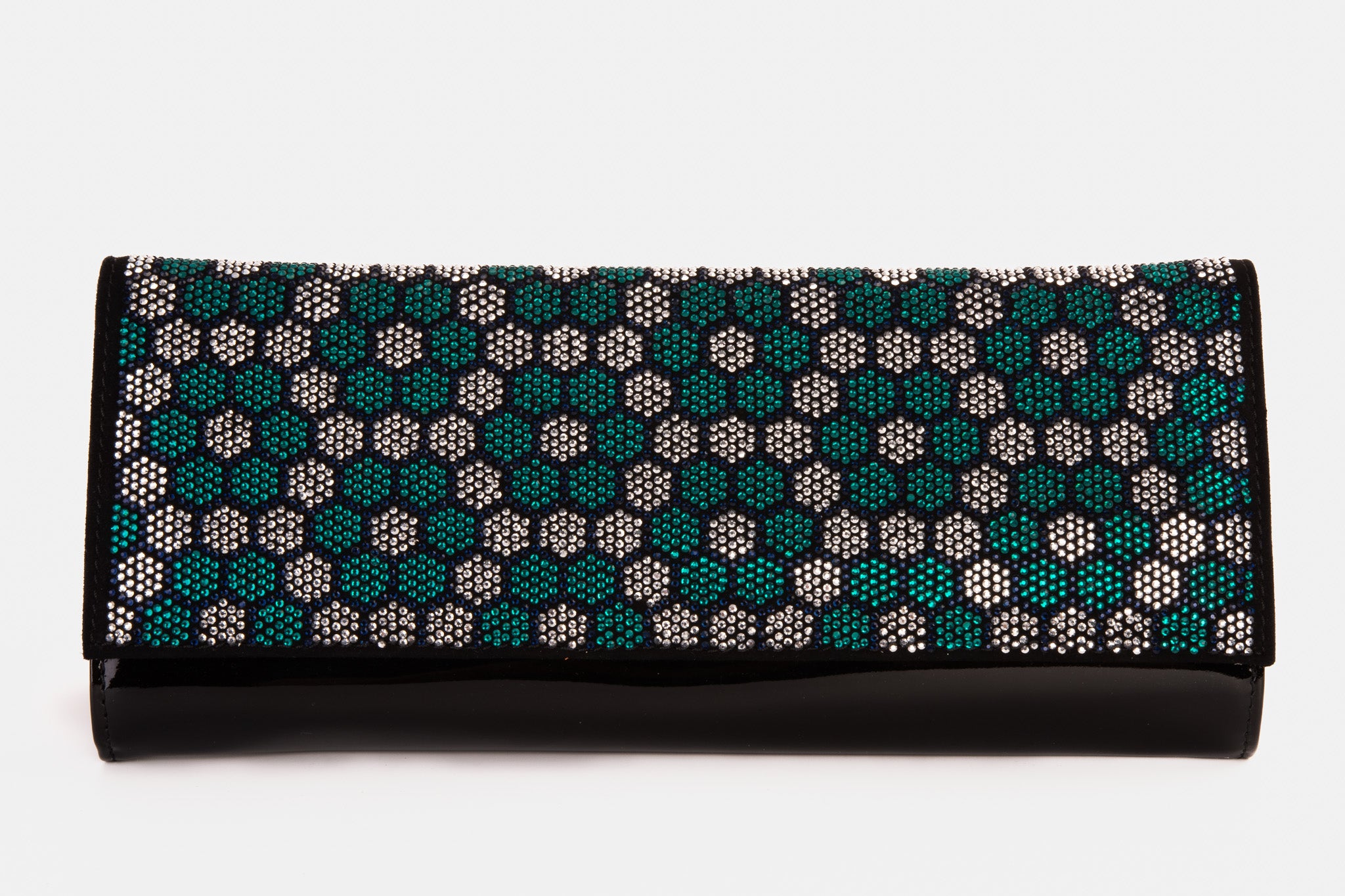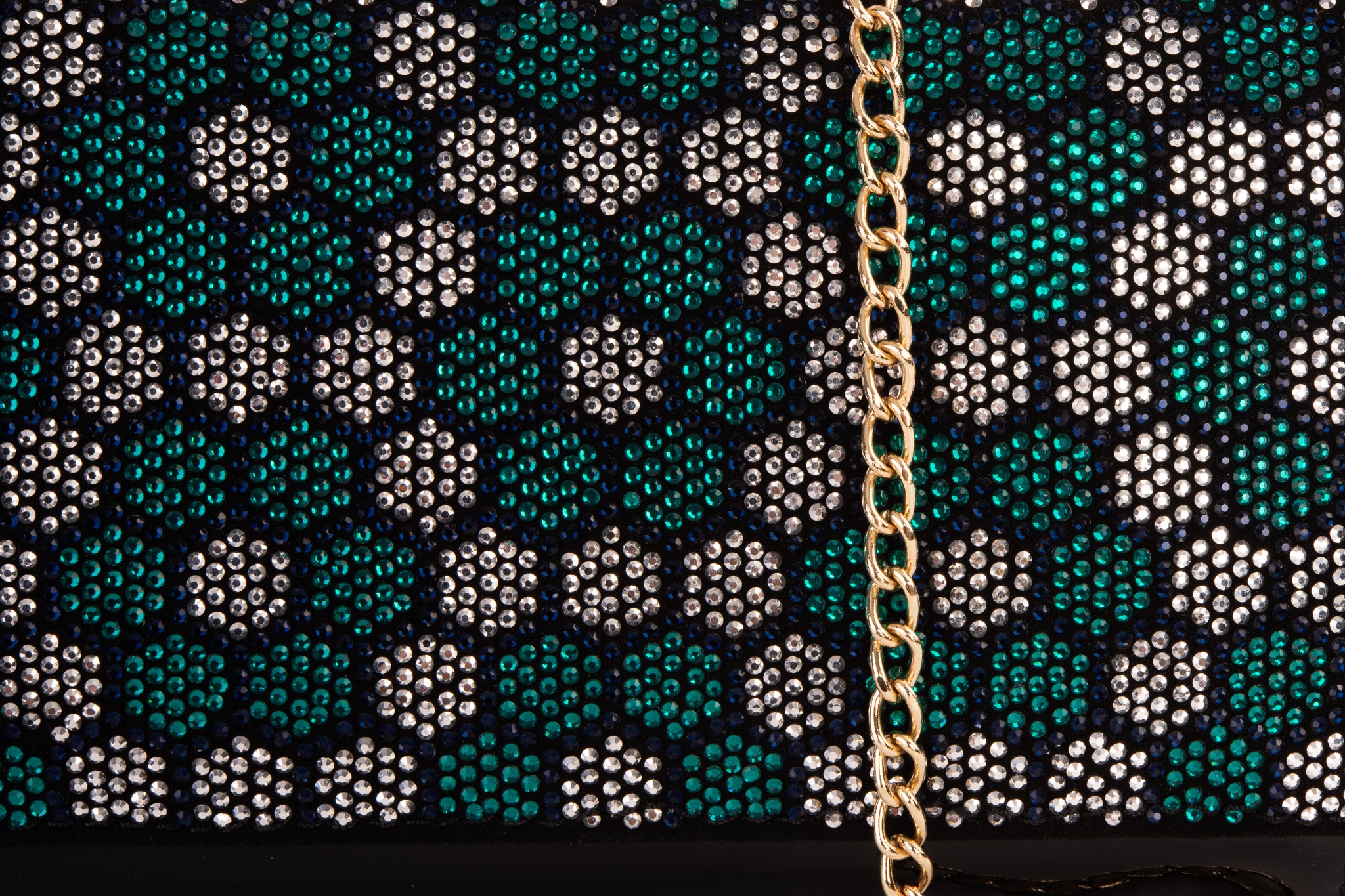 2. Handcrafted Turquoise and Silver Embellishments: The clutch is adorned with handcrafted turquoise and silver stones, carefully placed for a glamorous and radiant appeal, showcasing exquisite attention to detail.