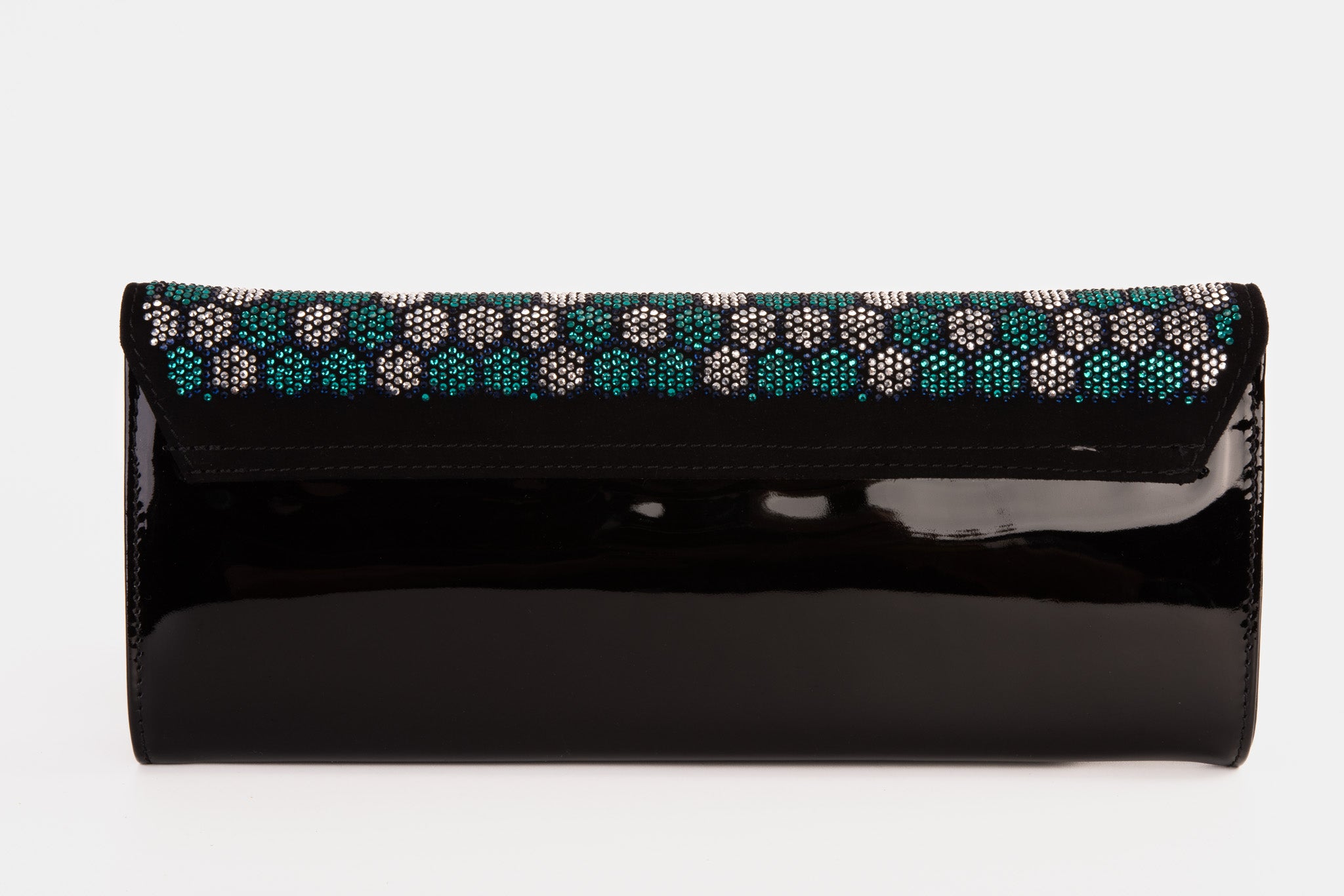 1. Luxurious Black Patent Leather Craftsmanship: Immerse yourself in opulence with the Doha Black Leather Glitter Clutch, meticulously crafted from premium quality black patent calf leather, offering a touch of luxury with its smooth and refined texture.